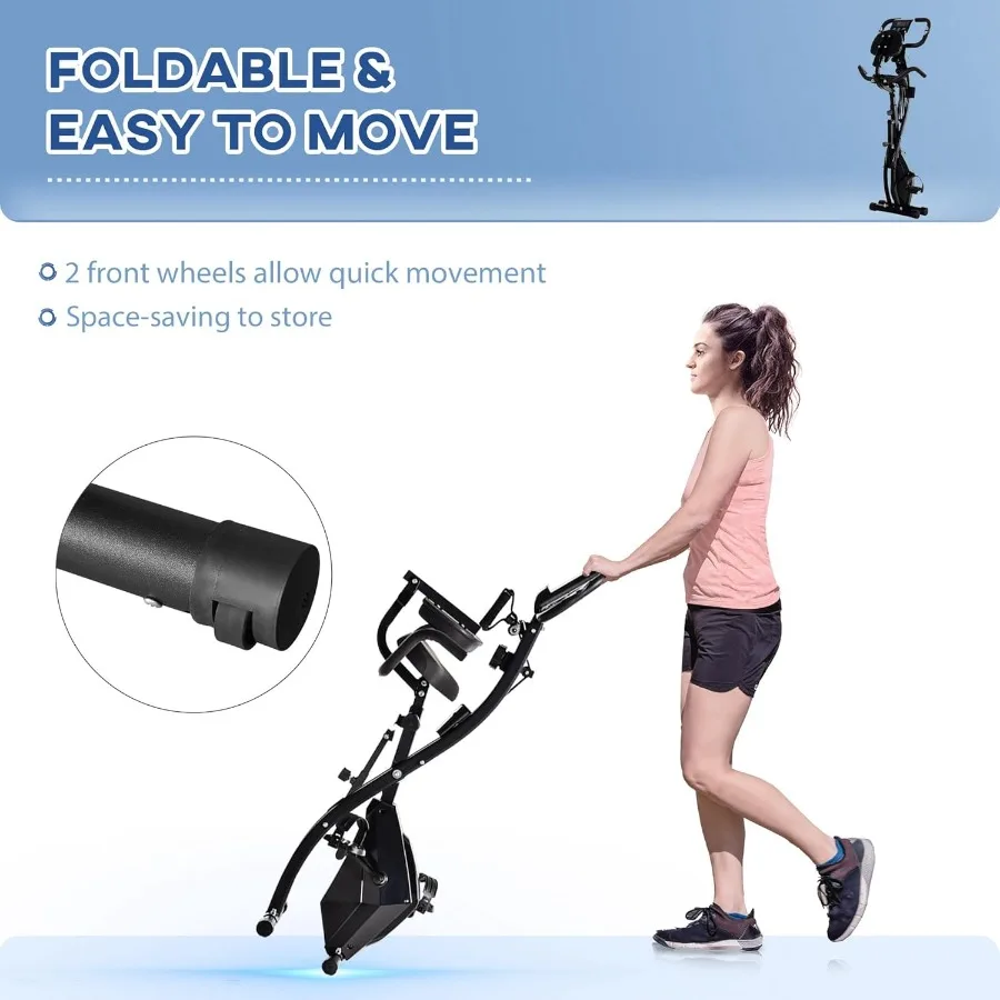 - Home Exercise Bike: Our folding exercise bike can convert between an upright and recumbent exercise bike. Surprise! This stationary bike does have wheels. Move your bike around your home with little effort.
